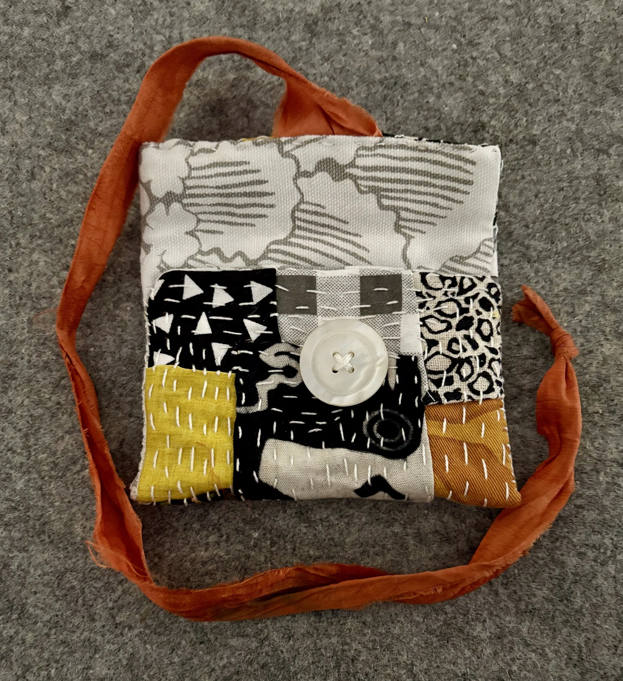 Made from cotton clothing/linens, silk sari ribbon, and a cool button